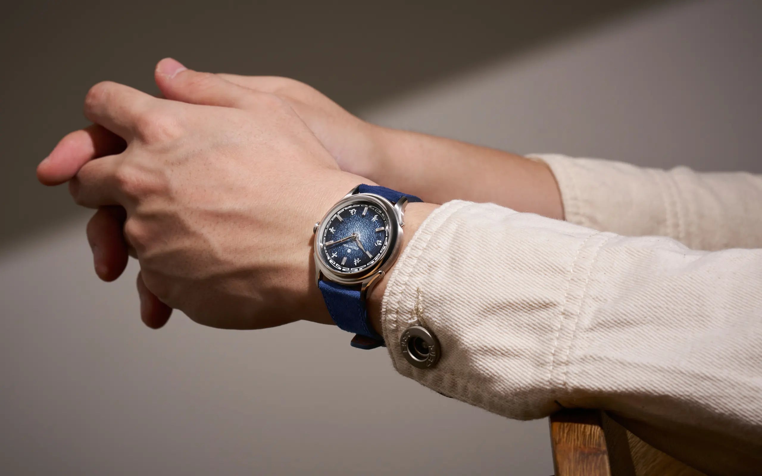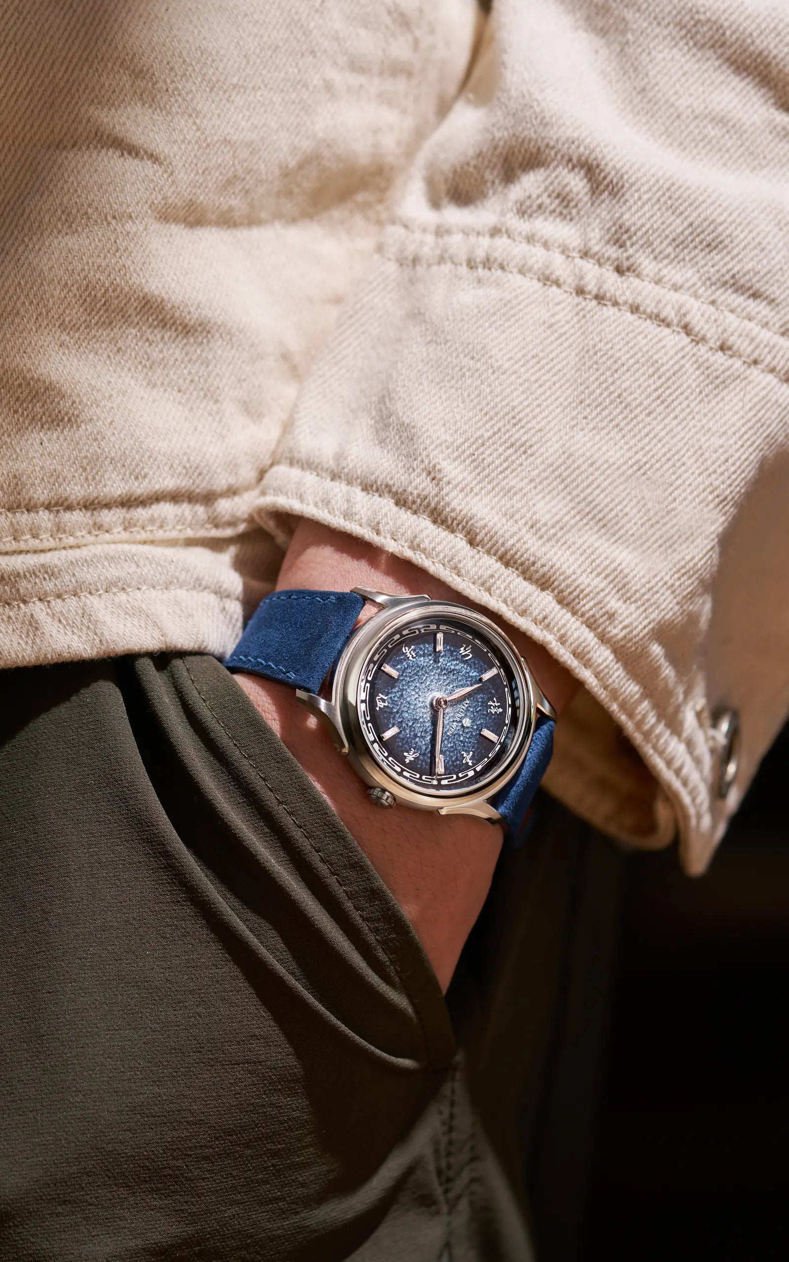 Our blue lambskin suede strap mirrors the blue tones of Ancestra 蛟 (JIĀO)’s fumé dial. Its velvety texture