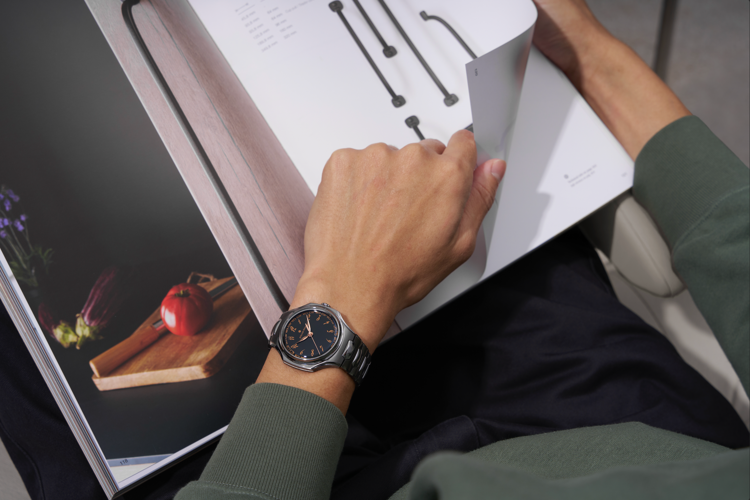 - Finished with mirror-polished chamfers, strong vertical brushing and sandblasted accents