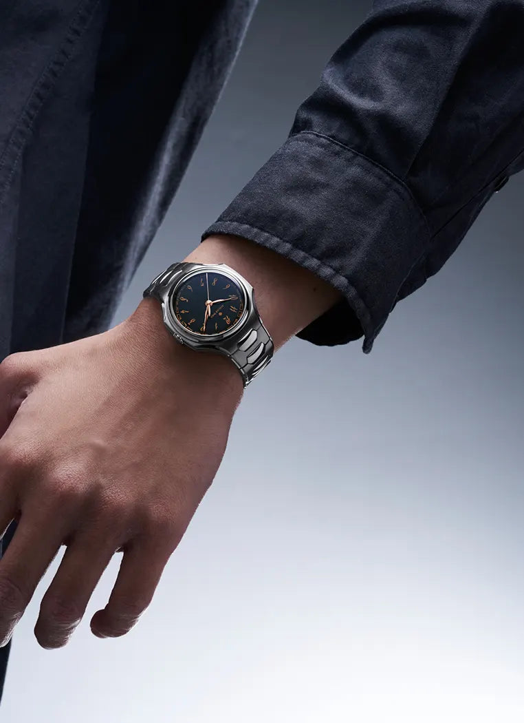 Inflection is an unprecedented collection of 99.9% pure tantalum integrated bracelet watches featuring grand feu enamel dials crafted by the workshop of 孔令俊 (Kong Lingjun), the foremost enamel dial atelier in China. It houses an iconic movement from haute horlogerie manufacture Girard-Perregaux; the calibre 03300, that has been heavily customised and decorated in a variety of premium finishes.