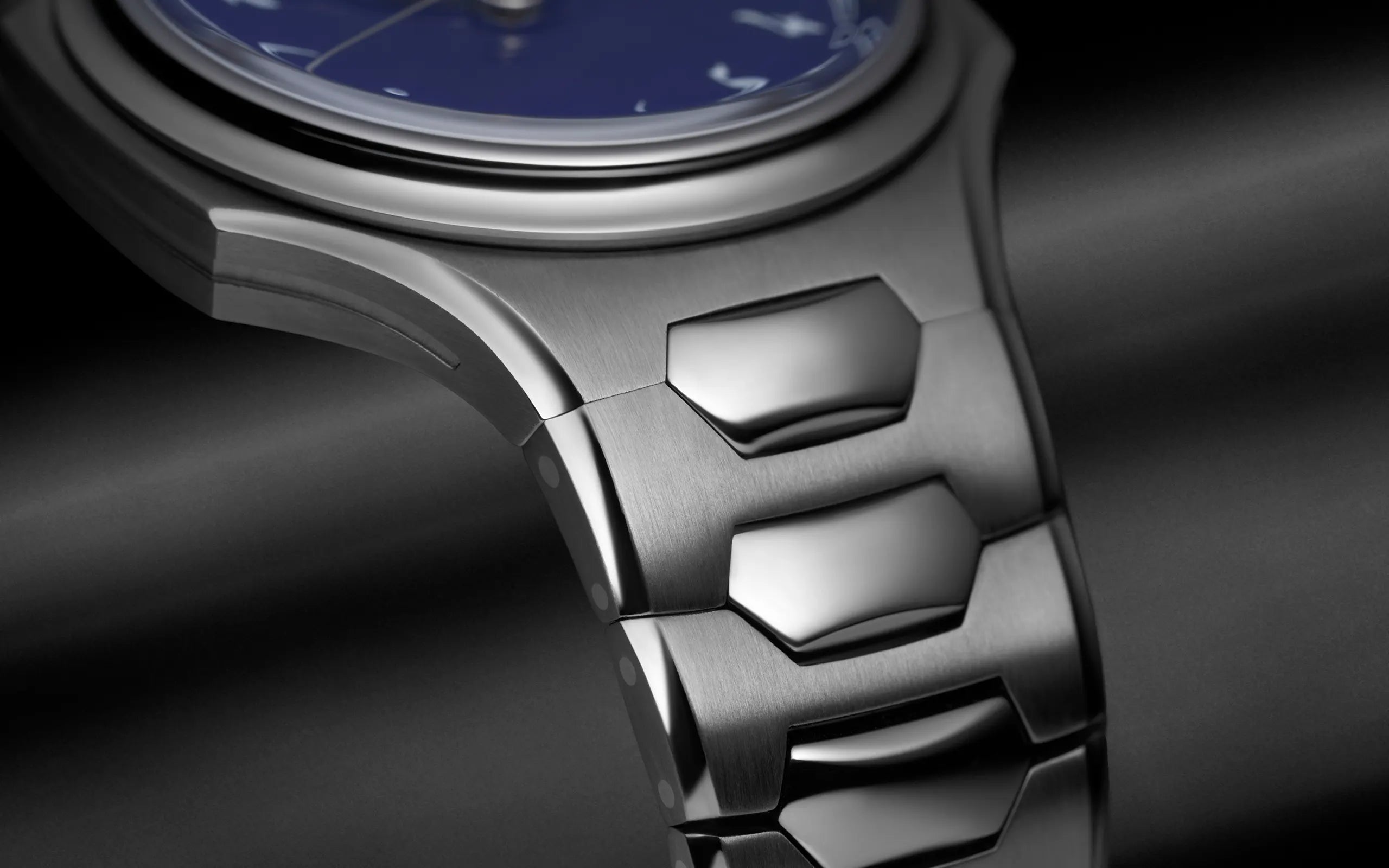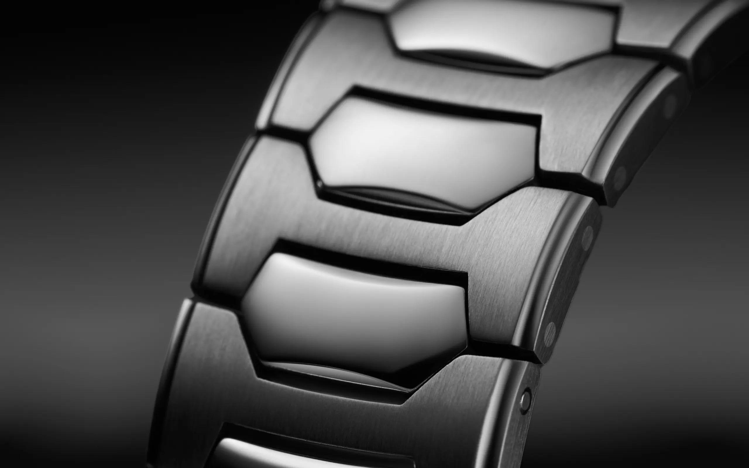 - Curved external and middle links, with strong vertical brushing on the external links and mirror-polishing on the middle links