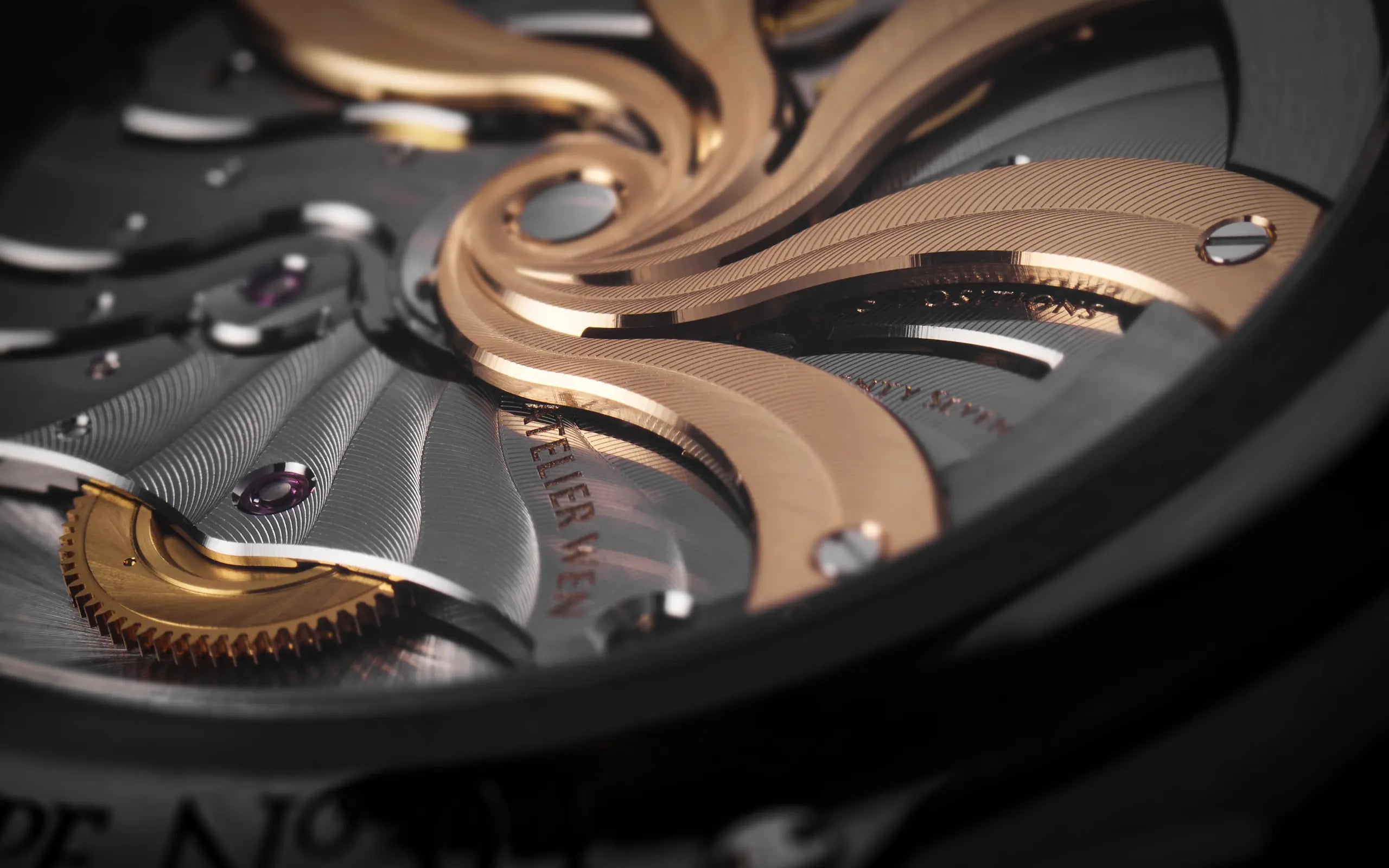 the movement. They are complemented by black-polished screws, and a similarly wind-inspired rotor that has