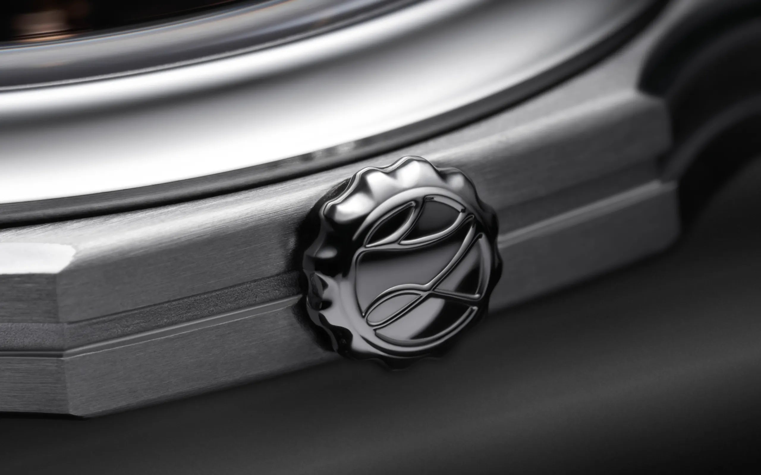 dramatic anglage, sharp exterior angles and laser-etched waved côtes that emanate radially from the centre of