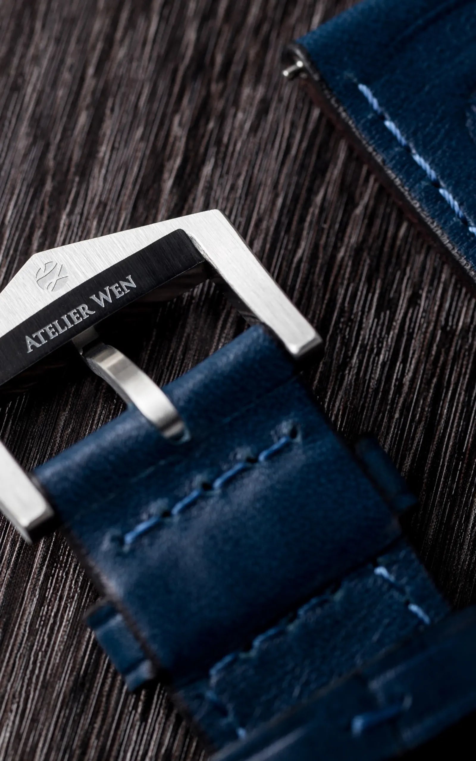 - Top-grain blue calfskin leather strap (by default), with salmon leather, brown leather and grey nubuck options.