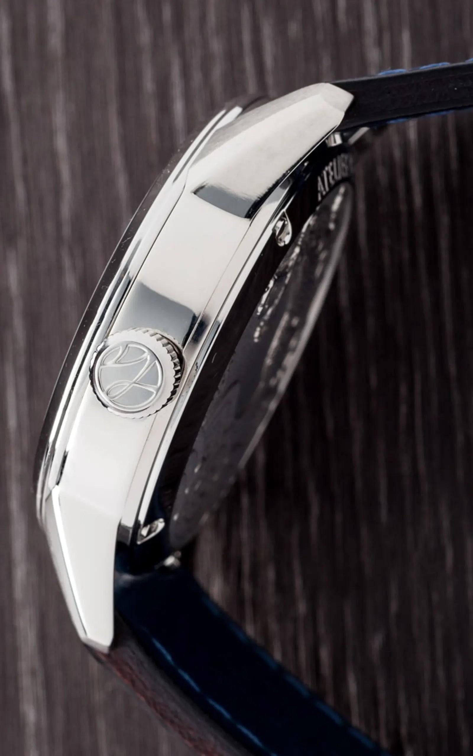 - Top-grain blue calfskin leather strap (by default), with salmon leather, brown leather and grey nubuck options.