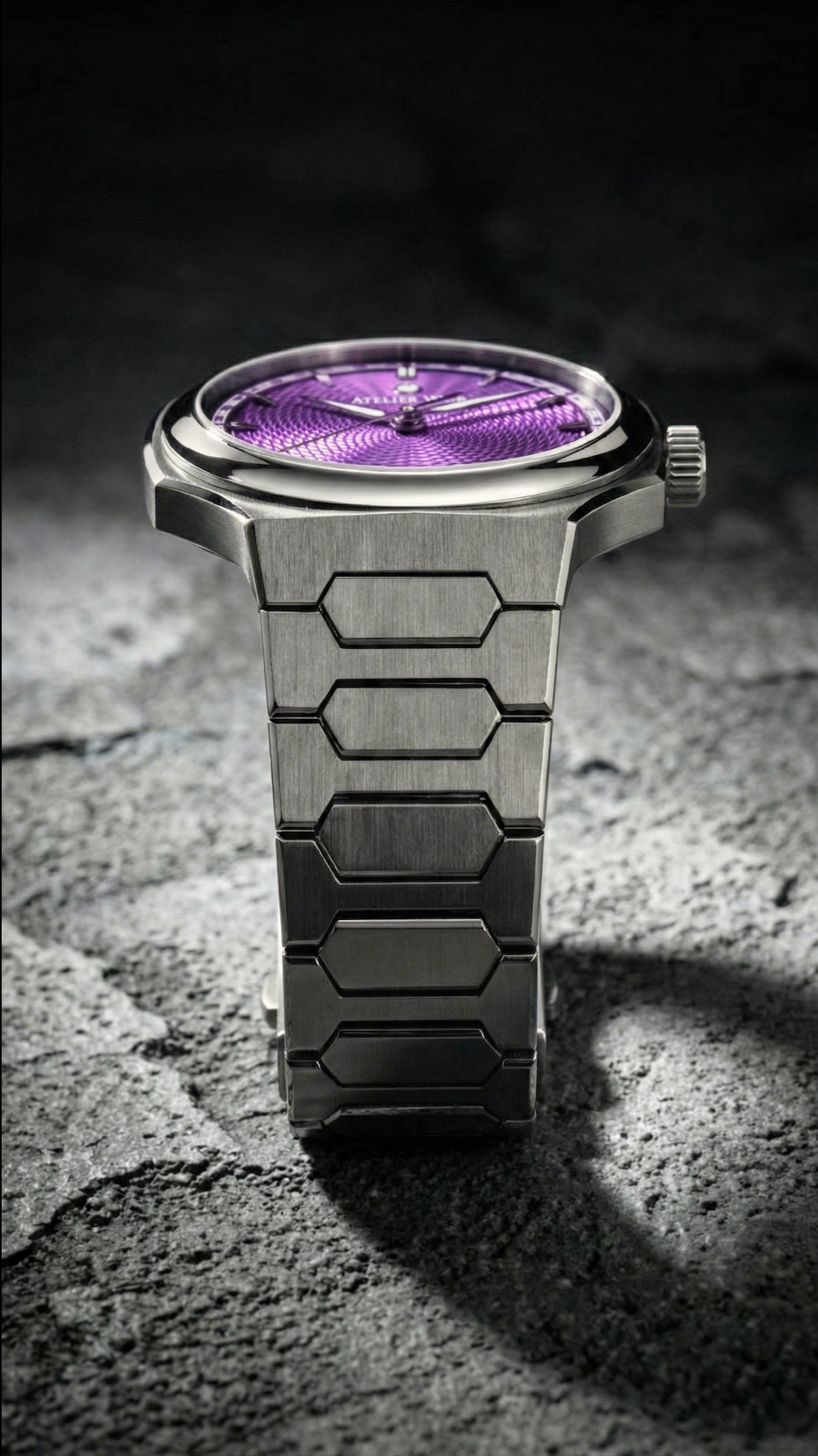 On the wrist, this path breaks up into its individual tiles; each link reflecting light differently in a